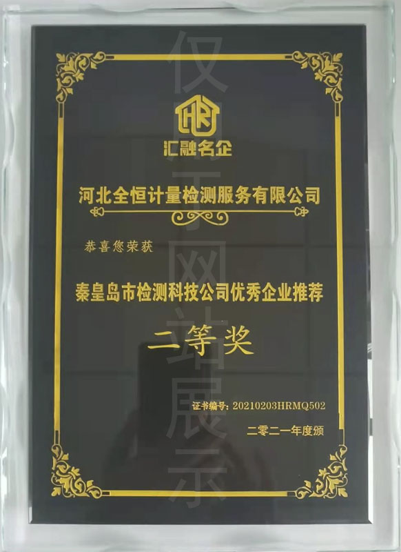 秦皇島市檢測科技有限公司優(yōu)秀企業(yè)推薦二等獎