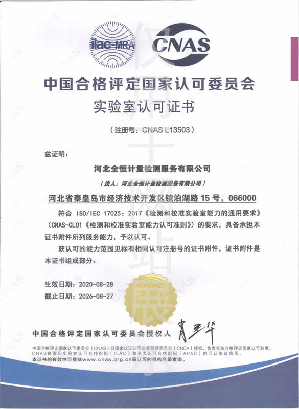 中國合格評定國家認可委員會實驗室認可證書